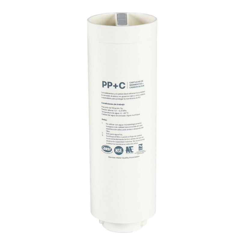 Филтърният патрон PPC е съвместим със системата за обратна осмоза Ecoperla Rocket и съчетава механично пречистване с високоефективен активен въглен от кокосови черупки. Елиминира фини механични примеси, хлор и неговите съединения, както и други нежелани вещества от водата. Благодарение на голямата си филтрираща повърхност, осигурява висока ефективност и дълъг живот.