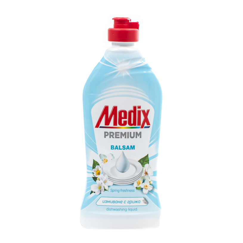 Kонцентриран препарат за измиване на съдове MEDIX PREMIUM – безмилостен към мазнините и упоритите остатъци от храна. Активните компоненти и дълготрайна пяна осигуряват ефикасно измиване за блестящи от чистота съдове и прибори. MEDIX PREMIUM - НАЙ-МОЩНАТА ФОРМУЛА НА MEDIX СРЕЩУ МАЗНИНИ, според проведени сравнителни вътрешни лабораторни тестове спрямо останалите препарати Medix за ръчно измиване на съдове. С нежен флорален аромат.