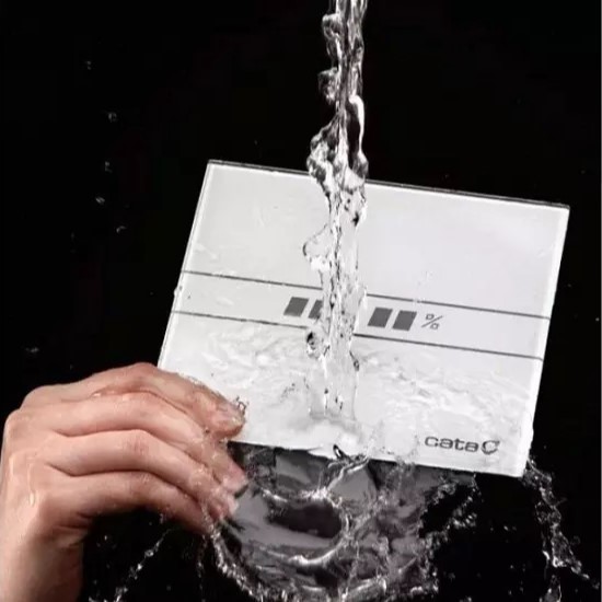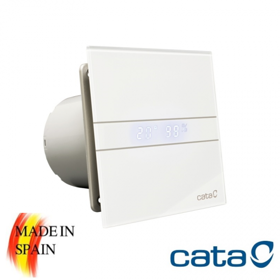 Вентилатор за баня CATA E-100 GTH е с преден панел от стъкло, сваляем за лесно почистване. Електронен дисплей с индикатори за температура и влага с възможност за избиране между 2 скорости - 1ва скорост: 4W, 17 dB(A), 36 куб.м – постоянна режим на работа и 2ра скорост: 8W, 31 dB(A), 115 куб.м.
